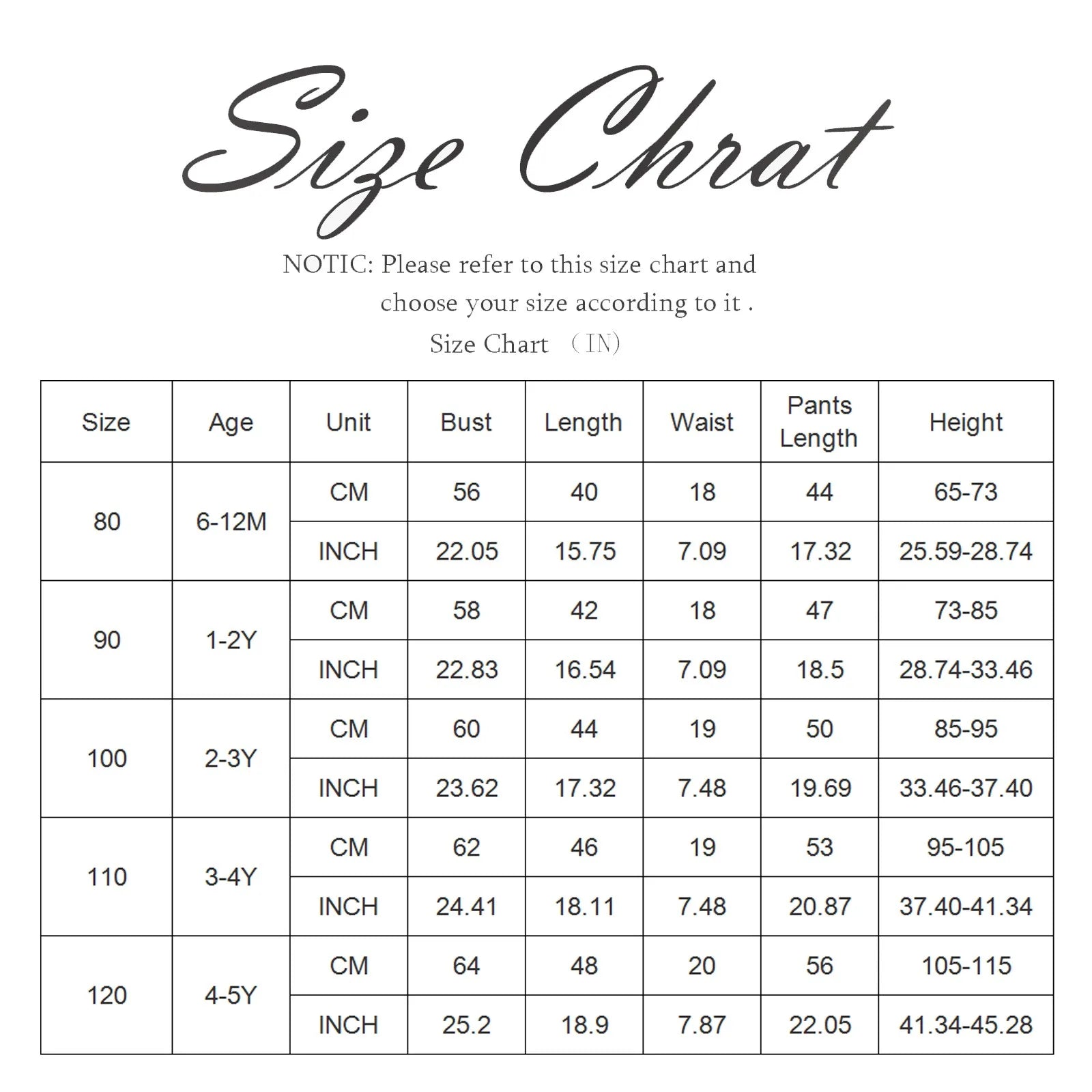 | Size | Age | Bust | Length | Waist | Pants Length | Height |