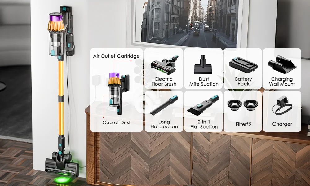 Our Cordless Vacuum Cleaner have 650W high power and up to 55kPa strong suction power, can easily suck out deep dust, pet hair and stubborn particles. Meet the different needs of floor dusting, carpet deep cleaning, crevice descaling, etc., whole house cleaning in one machine. Intelligent LED screen display, power and gear at a glance, finger touch to switch between different gears, different scenes without complex operation.
