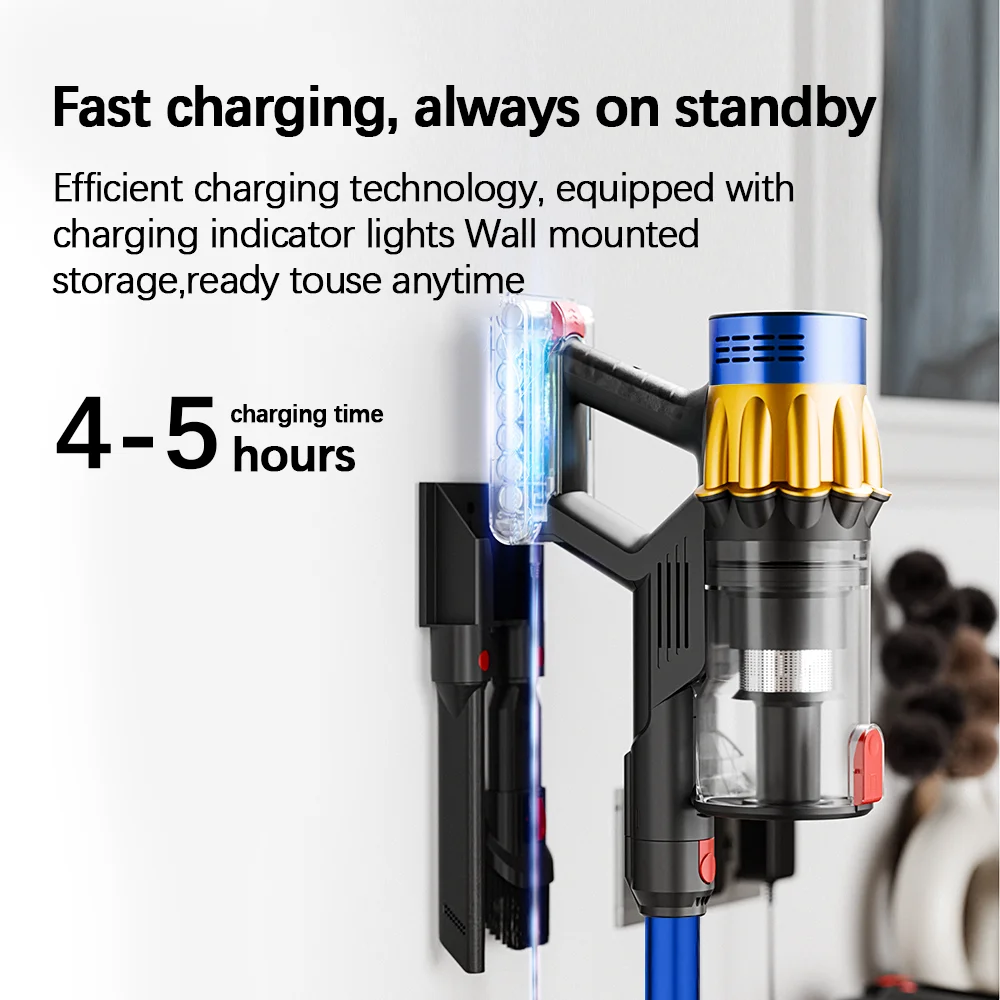 The Portable cordless vacuum cleaner has 8 built-in 2200mAh batteries, which can be fully charged in 4-5 hours, with a maximum range of up to 60 minutes, easily coping with 300 square meters of large household cleaning without charging midway! Comes with a no-punch bracket, easy to store on the wall, space-saving, say goodbye to cord entanglement, take it with you, home tidiness +100%! Cordless design + ergonomic handle, flexible to clean high places, under beds, sofa seams, so that hidden dust has nowhere to escape!