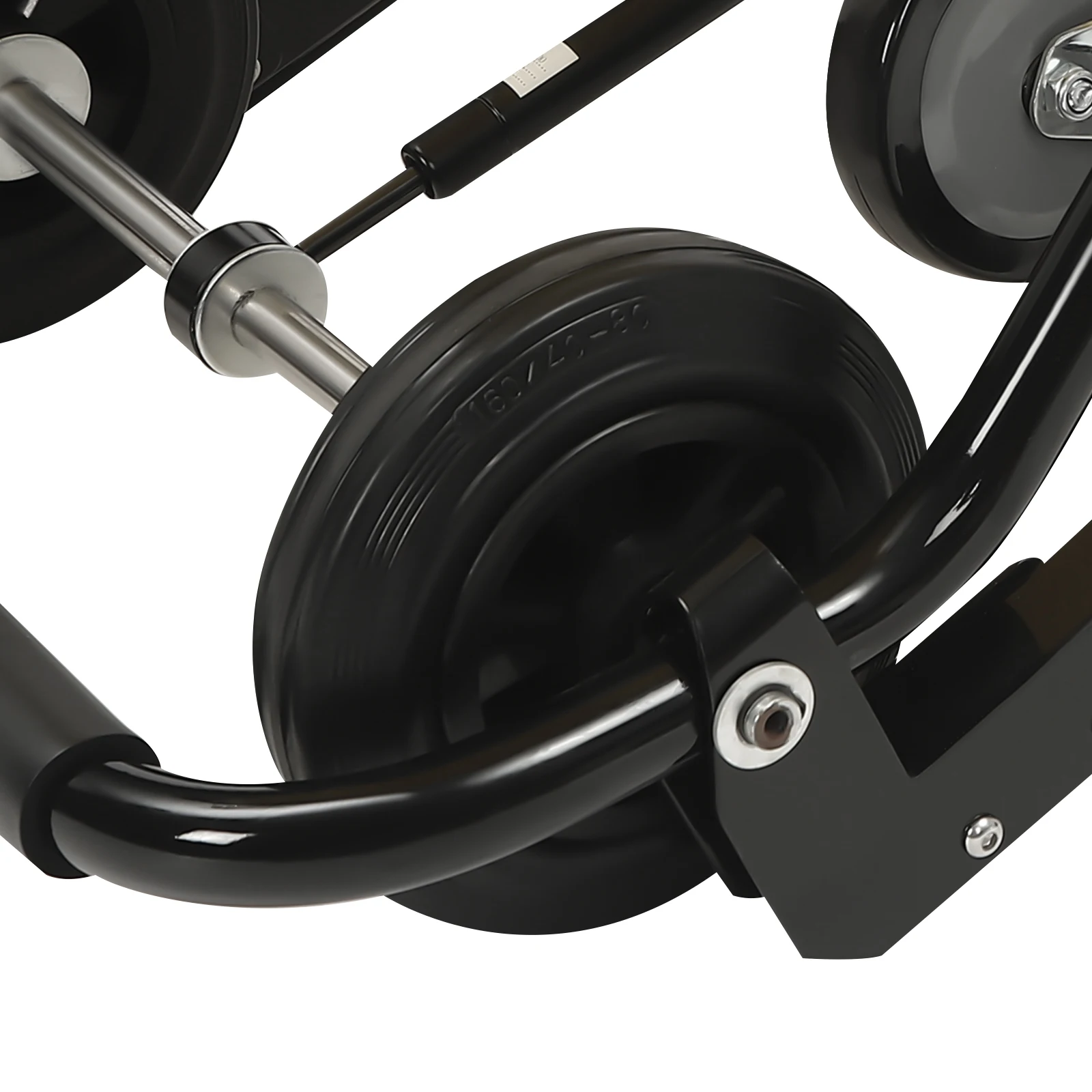 2. Push the first step with the foot pressure fixed rod, cocking the cart to ensure that the front wheels are suspended, relying on the climbing track slide.