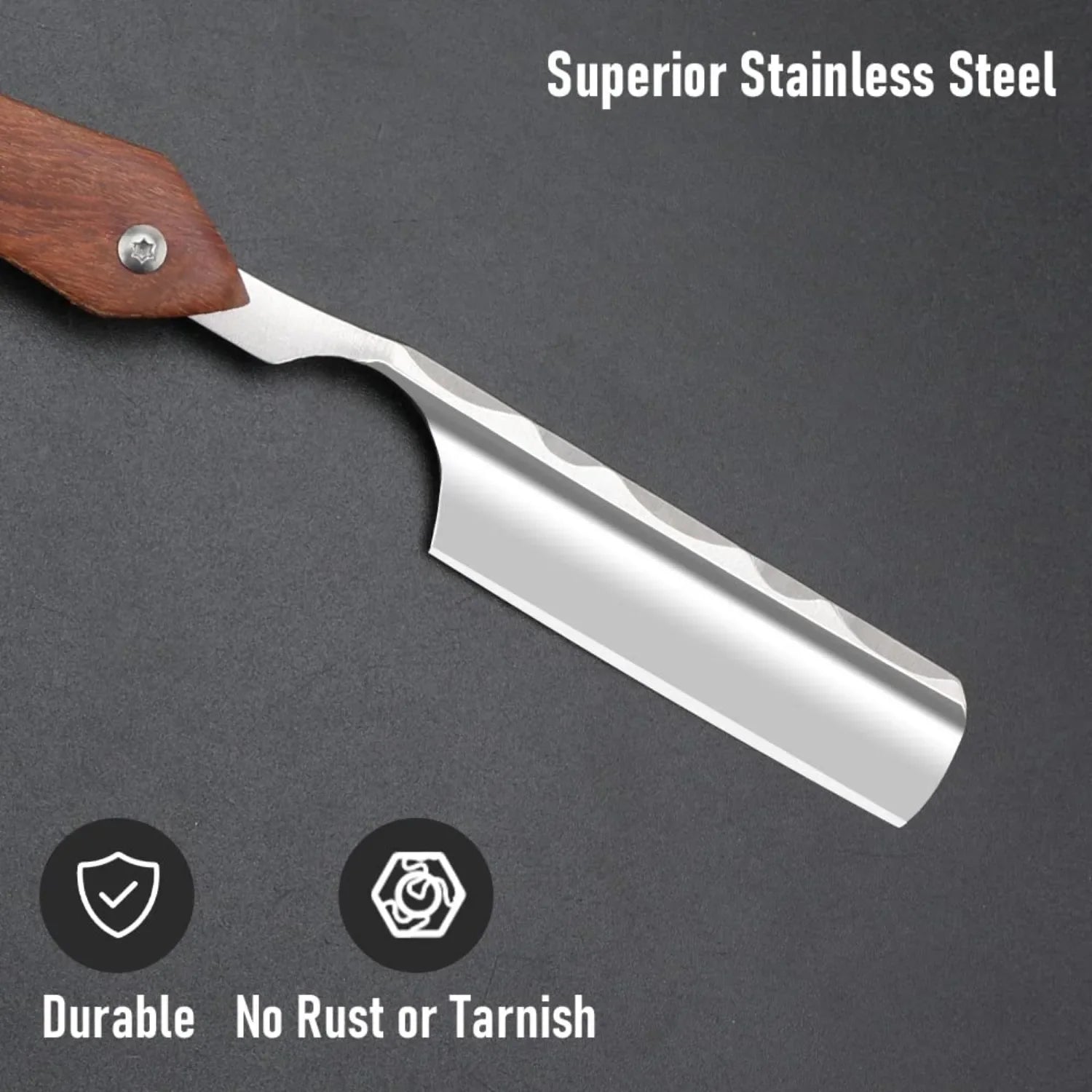 【High Quality Material】The manual razor adopts a stainless steel blade and a wooden handle, plus a special sharpening cloth for the razor. The razor blade has high hardness, not easy to rust in a humid environment, has strong heat resistance, more convenient to clean and maintain, and has a long service life.